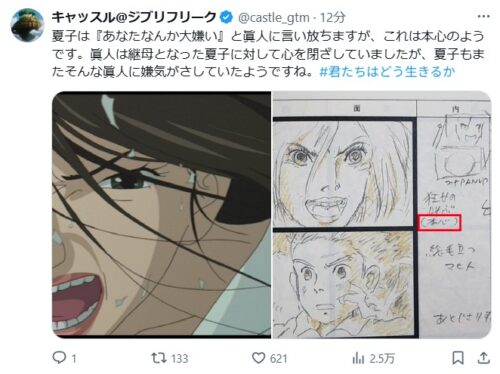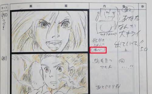 上画像は宮崎駿監督の絵コンテだと情報がありのですが、上画像の夏子が険しい表情で「大嫌い」と叫んだのです。絵コンテには「狂女の叫び(本心)」とも記載があるのです…。これらのことから考察が可能だと考えられます。